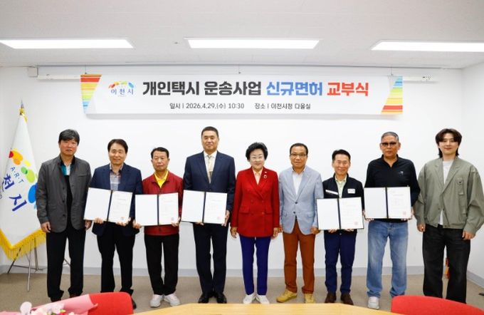 (중부시사신문) 이천시는 29일 시청 다올실에서 개인택시운송사업 신규 면허증 교부식을 개최하고, 심사를 통해 최종 선정된 5명의 대상자에게 면허증을 전달했다고 밝혔다.