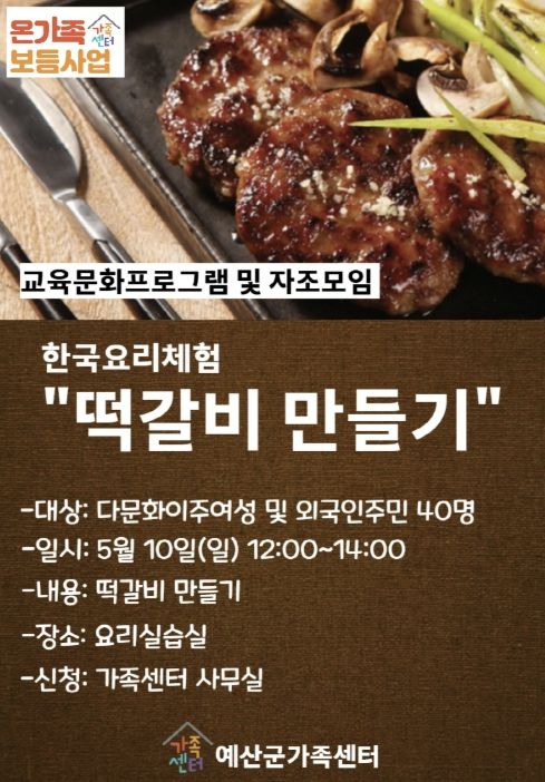 (중부시사신문) 예산군가족센터는 지역 내 결혼이주여성과 외국인 주민의 한국문화 이해 증진과 안정적인 정착 지원을 위해 오는 5월 10일 한국전통요리 체험 ‘떡갈비 만들기’ 프로그램을 운영한다고 밝혔다.