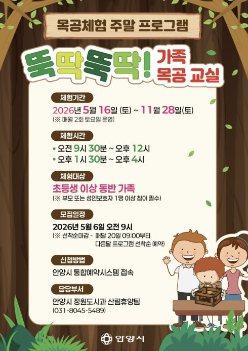 (중부시사신문) 안양시는 초등학생과 가족이 함께 참여할 수 있는 목공체험 주말 프로그램인 ‘뚝딱뚝딱! 가족 목공 교실’을 운영한다고 30일 밝혔다.