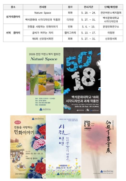 삼거리 갤러리에서는 △20~ 24일, ‘Nature Space’ 회화전 △27~ 31일, 백석문화대 시각디자인과 작품전이 열린다.