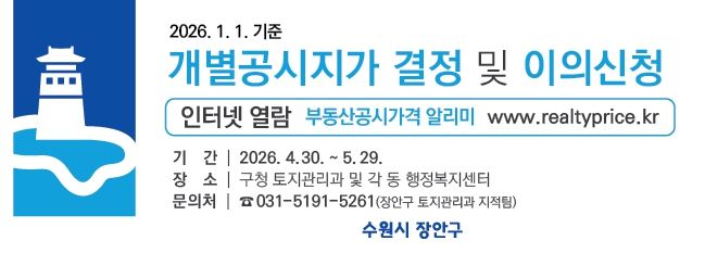 (중부시사신문) 수원시 장안구는 2026년 1월 1일 기준 장안구 관내 26,934필지에 대한 개별공시지가를 4월 30일에 결정·공시하고, 다음 달 29일까지 이의신청 접수를 받는다고 밝혔다.