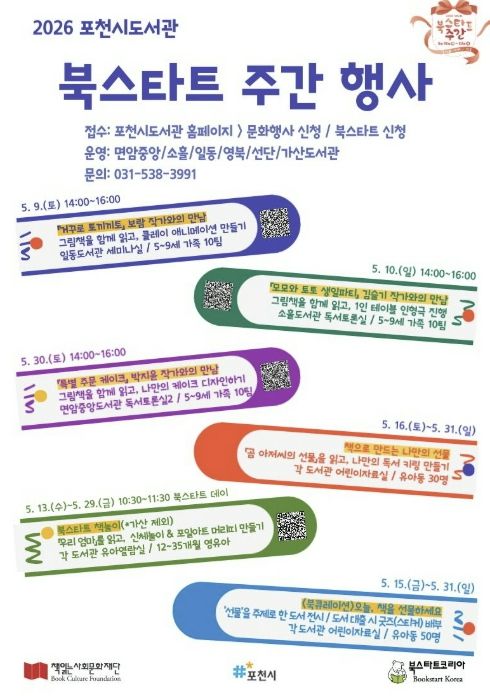 (중부시사신문) 포천시도서관은 북스타트코리아와 책읽는사회문화재단이 주최하는 ‘2026 북스타트 주간 지원사업’에 선정됨에 따라, 5월 9일부터 면암중앙·소흘·일동·영북·선단·가산도서관 등 6개소에서 북스타트 주간 행사를 운영한다.