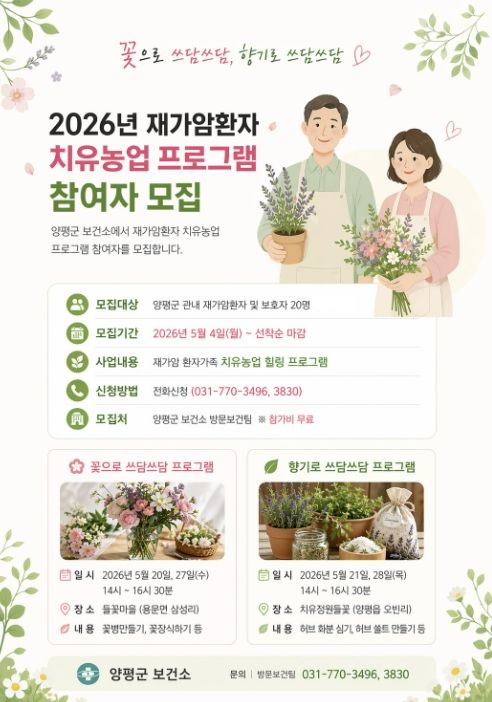 (중부시사신문) 양평군보건소는 재가암환자와 돌봄 가족의 정서적 안정과 건강 회복을 지원하기 위해 ‘2026년 재가암환자 치유농업 프로그램’ 참여자를 오는 5월 4일부터 모집한다고 밝혔다.