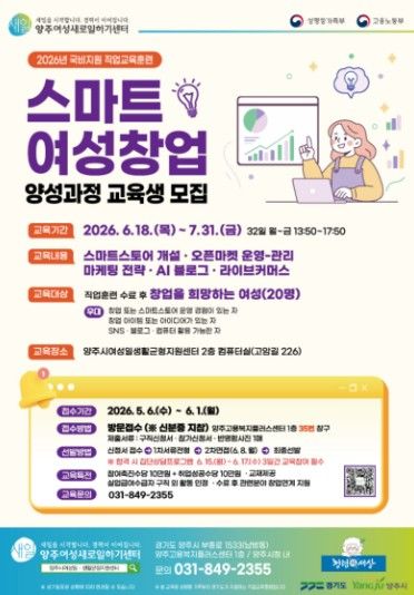 (중부시사신문) 경기 양주시가 오는 5월 6일부터 6월 1일까지 ‘스마트 여성창업 양성과정’ 교육생 20명을 모집한다고 밝혔다.