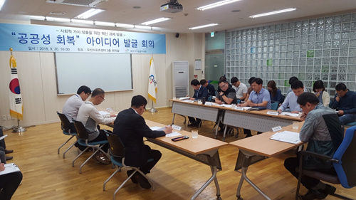 발굴된 아이디어로는 공공성 회복과 사회적 가치 창출을 위한 일자리 창출, ISO 37001 부패방지경영체제 인증 및 ISO 26000 사회적 책임 경영진단, 공공성 회복을 위한 소비자중심경영(CCM) 인증, 공영주차장 내 안심택배함 운영, 사회적 취약계층을 위한 운동프로그램 신설, 이동지원차량 이용고객 승․하차 도우미 지원, 원동초 스포츠센터 어린이강좌 ‘행복나눔’ 발표회 등 각 분야별로 다양한 아이디어들이 논의됐다.