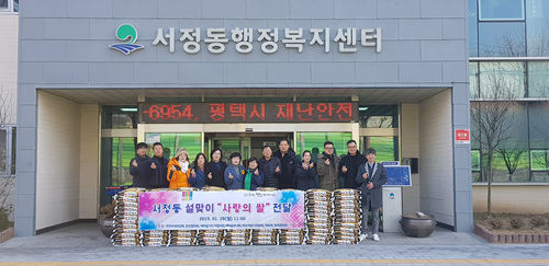 평택시 서정동 7개 단체협의회(주민자치위원회, 통장협의회, 새마을지도자, 새마을부녀회, 바르게살기위원회, 생활체육회, 방위협의회)는 28일 설을 맞아 주위의 어려운 이웃에게 전달해 달라며 백미 350포(3,500kg)를 전달했다.