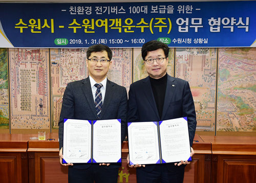 수원시와 수원여객운수(주)는 1월 31일 시청 상황실에서 ‘친환경 전기버스 보급 활성화를 위한 업무 협약’을 체결하고, ‘2019년 전기버스 100대 보급’을 목표로 협력하기로 했다.