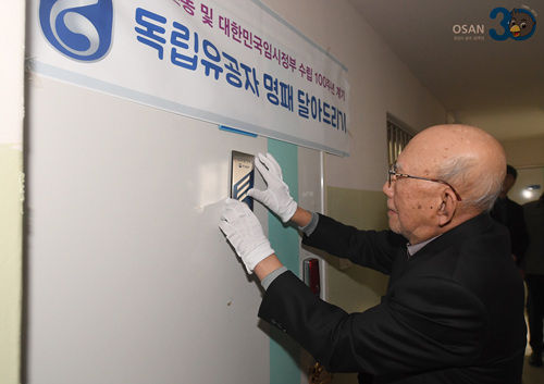 나치만 경기남부보훈지청장, 곽상욱 오산시장은 조국 독립을 위해 헌신한 독립유공자 유우국의 자 유시찬님 가정을 찾아 독립유공자 명패를 직접 달아드리며 감사인사를 전했다.