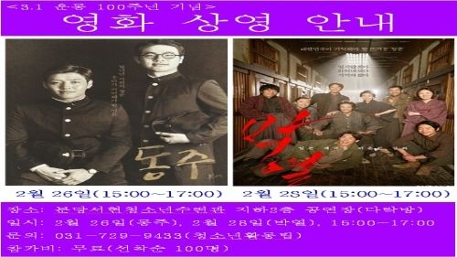 성남시청소년재단(이사장 은수미) 분당서현청소년수련관은 2월 26일(화)부터3월 10일(일)까지 12일간 3·1운동 100주년 기념하는 체험·전시·영화 상영회를 진행한다.
