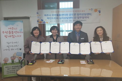 여주시(시장 이항진)는 지난 3월 15일 여주시 무한돌봄센터에서 공도양 심리상담센터와 마인드펀치 심리상담센터 간 관내 저소득 위기 가정 지원에 대한 업무협약을 체결했다고 밝혔다.