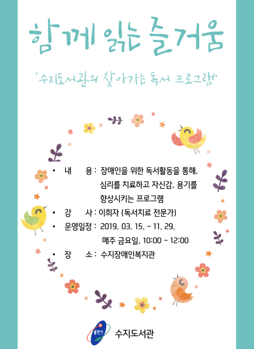 수지도서관은 3월 15일부터 11월까지 매주 수지장애인복지관을 찾아 장애인들에게 심리적 안정과 의사표현력을 돕는 독서치료 프로그램을 운영한다.