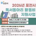 (중부시사신문) 포천시가 시민들의 독서 활동 기회 보장 및 지역내 독서동아리 활성화를 위해 2026년 독서동아리 활동비 지원 사업을 실시한다. 독서동아리 활동비 지원 사업은 공모를 통해 선정된 독서동아리들을 대상으로 도서구입비, 인쇄비, 강사료 등 독서동아리 운영에 필요한 활동비를 지원하는 사업이다. 지난 2022년부터 시행했으며 작년의 경우 18개 독서 동아리가 선정됐다. 사업 신청 대상은 포천시 도서관에 등록되어 있으면서 월 1회 이상 활동하는 5인 이상으로 구성된 독서동아리다. 동아리원들의 70% 이상이 포천시민(주민등록지 기준 포천시 거주자 또는 포천시 소재 직장인)이어야 하며 직계 가족의 비율이 50% 미만, 타 동아리 중복 회원 비율이 20% 이하로 구성돼 있어야 한다. 도서관 관계자는 “독서동아리는 다양한 생각이 있는 사람들이 함께 모여 꾸준한 독서 습관을 기를 수 있는 지역 공동체”라며 “이번 독서동아리 활동비 지원사업이 포천 시민들의 자발적이고 풍성한 독서 활동에 도움이 되길 바란다”고 밝혔다. 독서동아리 활동비 지원사업을 희망하는 독서동아리는 오는 3월 16일부터 3월 31일까지
