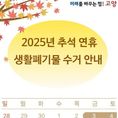 (중부시사신문) 고양특례시는 다가오는 추석 연휴를 맞아 시민들이 쾌적하고 깨끗한 환경 속에서 명절을 보낼 수 있도록 ‘추석 연휴 생활쓰레기 관리대책’을 수립해 본격 추진한다. 시는 10월 3일부터 9일까지 연휴 기간 동안 상황반과 기동청소반을 운영해 각종 민원과 긴급 상황에 신속 대응하고, 생활쓰레기와 무단 방치쓰레기를 집중 수거할 예정이다. 아울러 연휴 기간 쓰레기 배출일 사전홍보와 쓰레기 상습 투기 우려지역에 대한 집중 단속도 병행한다. 특히, 10월 8일 대체공휴일에도 생활쓰레기 수거를 정상적으로 실시해 시민 불편을 최소화할 방침이다. 다만, 10월 5일, 6일(월·추석), 7일 3일간은 휴무로 인해 수거가 이뤄지지 않는다. 이에 따라 쓰레기 배출은 반드시 수거일 전날 일몰 이후에 해야한다. 시 관계자는 “쾌적하고 깨끗한 명절 분위기 조성을 위해 추석 연휴 기간 생활쓰레기 수거에 만전을 기하겠다”며 “각 가정에서도 음식물 쓰레기 줄이기, 재활용품 분리배출 등 생활쓰레기 감량에 적극 협조해 주시기를 바란다”고 전했다.