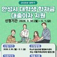 (중부시사신문) 안성시는 대학생 및 대학원생들의 교육비 부담을 덜어주기 위해 ‘2026년 상반기 대학생 학자금 대출이자 지원사업’을 시행한다고 밝혔다. 지원 대상은 공고일(2026. 3. 24.)기준으로 안성시에 주소를 두고 있는 대학생 및 대학원생(휴학생 포함)이다. 신청 기간은 3월 30일부터 5월 1일까지이며, 신청을 희망하는 학생은 주소지 읍·면·동 행정복지센터 또는 안성시청(미래교육과)를 방문하여 신청서와 구비서류(주민등록등본, 재학증명서)를 제출하면 된다. 지원 대상자로 선정되면 대상자가 한국장학재단에서 대출받은 학자금에 대한 2025년 하반기(7월~12월) 발생 이자를 안성시가 지급하게 된다. 지급은 대출 계좌 원리금에서 차감하는 방식으로 진행되며, 지원 결과발표 및 이자는 오는 6월 지급 예정이며, 확정된 시점에 한국장학재단 인터넷 홈페이지 및 고객센터에서 확인할 수 있다. 안성시 관계자는 “학자금 대출이자 지원사업을 통해 대학생들의 학업 부담을 완화하고, 학업에 전념할 수 있는 환경을 조성하는 데 도움이 되길 바란다”고 말했다.