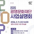 (중부시사신문) (재)광명문화재단은 2026년 (재)광명문화재단 사업설명회를 3월 11일 오후 2시 광명시민회관 리허설룸에서 개최한다. 이번 설명회는 광명문화재단의 2026년 비전 및 추진 방향을 시작으로 지역(생활) 문화, 공연·전시, 문화예술교육 및 지원, 문학 사업 소개와 참가자 질의응답 순서로 진행된다. 특히 재단에서 진행하는 공모사업을 ‘2026 광명문화재단 문화예술지원 사업 통합공모’로 묶어 소개하여 각 프로그램의 주요 내용, 운영 일정, 신청 방법 등 정보를 자세하고 정확하게 접할 수 있다. (재)광명문화재단 송은영 대표이사는“재단이 준비한 다양한 사업을 시민 여러분께 직접 소개하고 의견을 듣는 뜻깊은 자리”라며 “이번 사업설명회를 통해 더 많은 분들이 관심을 갖고 여러 사업에 편하게 참여해 주시면 좋겠다.”라고 밝혔다.