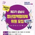 (중부시사신문) 성남시는 오는 2월 18일까지 ‘제3기 청년정책협의체’ 위원 100명을 공개 모집한다. 청년정책협의체는 지역 청년을 대표해 성남시에 청년정책을 제안하고 소통하는 청년 참여기구다. 제3기 협의체는 일자리·창업, 교육, 주거, 복지·문화 등 4개 분과로 구성된다. 선발되면 분과별로 △청년정책 의견 수렴과 정책 제안 △청년정책 모니터링 △청년정책 홍보 △ 청년의 날 기념 문화 행사 기획 등의 활동을 하게 된다. 제3기 협의체 활동 기간은 오는 3월부터 내년 말까지다. 시는 청년정책협의체 위원들이 정부의 제2차 청년정책 기본계획(2026~2030년)과 연계해 체계적인 정책 제안할 수 있도록 관련 정책 안내와 교육, 워크숍 등 활동의 장을 마련할 계획이다. 대면 회의에 참석한 위원에게는 참여 활동비 2만원을 지급하고, 우수 활동 위원에게는 연말 표창을 수여한다. 협의체 위원 참여 자격은 성남시에 거주하거나 지역 내 직장 또는 학교에 다니는 19~39세 청년이다. 시는 지원동기, 청년정책 관심도, 활동 경험 등을 서면으로 심사해 위원을 선발한다