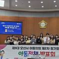 (중부시사신문) 오산시는 지난 20일 오산시의회 본회의장에서 ‘제9대 오산시 아동의회 제2차 정기회의’를 개최했다고 밝혔다. 제9대 오산시 아동의회는 오산시를 대표하는 아동 참여기구로, 지난 7월 발대식을 시작으로 본격적인 활동에 들어갔으며, 아동 권리 증진을 위한 캠페인과 시정 참여 확대를 위한 다양한 활동을 이어오고 있다. 이번 제2차 정기회의는 ‘아동정책 발표회’를 주제로 열렸으며, 아동의 참여권을 보장하고 시정 참여 기회를 확대하기 위해 5분 자유발언과 아동의회에서 직접 논의한 조례안 심의가 진행됐다. 이날 회의에서는 총 4건의 조례안이 상정돼 모두 원안 가결됐다. 5분 자유발언에서는 ▲학생들과 만들 교내 스마트폰 사용 규칙 ▲학교에서 동네까지, 내가 바라는 작은 변화 ▲오산 지역 안전과 교통 편의를 위한 개선 제안 ▲아파하는 지구, 청소년도 도울 수 있어요! 등 다양한 주제를 중심으로 아동 의원들의 자유로운 의견 발표가 이어졌다. 이날 가결된 조례안은 ▲오산시 어르신 스마트기기 활용 교육 지원 조례 ▲오산시 아동ㆍ청소년 흡연 예방 조례 ▲오산시 아동ㆍ청소년 문화, 예술 활동 지원에 관한