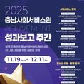 (중부시사신문) 충남사회서비스원(원장 김영옥)이 오는 11월 19일부터 12월 11일까지를 ‘2025 사회서비스원 성과보고 주간’으로 지정하고, 올해 추진한 사회서비스·청소년·정책연구 등 3개 분야에서 총 11개의 주요 사업 성과를 도민에게 공개하는 대규모 홍보 기간에 들어간다. 그동안 분야별로 흩어져 진행되던 성과보고회를 하나의 ‘2025 성과보고 주간’으로 묶어 운영하는 것은 이번이 처음이다. 충남사회서비스원은 이를 통해 기관의 공익적 역할을 보다 명확하게 알리고, 도민이 충남형 복지체계를 한눈에 이해할 수 있도록 한다는 계획이다. 성과보고 주간 동안 사회서비스·청소년·정책연구 등 3개 분야에서 총 11개의 성과 공유 행사가 순차적으로 열린다. 사회서비스 분야에서는 △사회보장위원회 실무워크숍(11.25.) △농·어촌 돌봄 성과공유회(11.27.) △소속시설 성과공유회(12.2.) △충남아동돌봄 성과보고회(12.4.) 등이 개최된다. 청소년 분야에서는 △학교밖청소년 성장보고회(11.19.) △청소년자원봉사대회 시상식(11.21.) △청소년상담복지센터 성과공유회(11.28.)△청소년활동진흥센터 성과공유회(12.3.) 등이